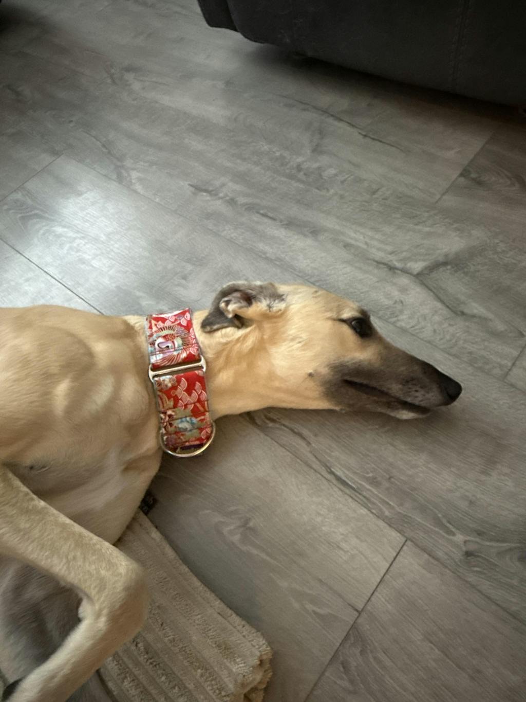 Martingale dog collar. Strong, soft and flexible polypropylene webbing, with a stunning Japanese fabric trim that shimmers with gold embellishment. Welded hardware. Handmade to order within 5 business days. Choice of collar width 1.5 or 2 inches.
