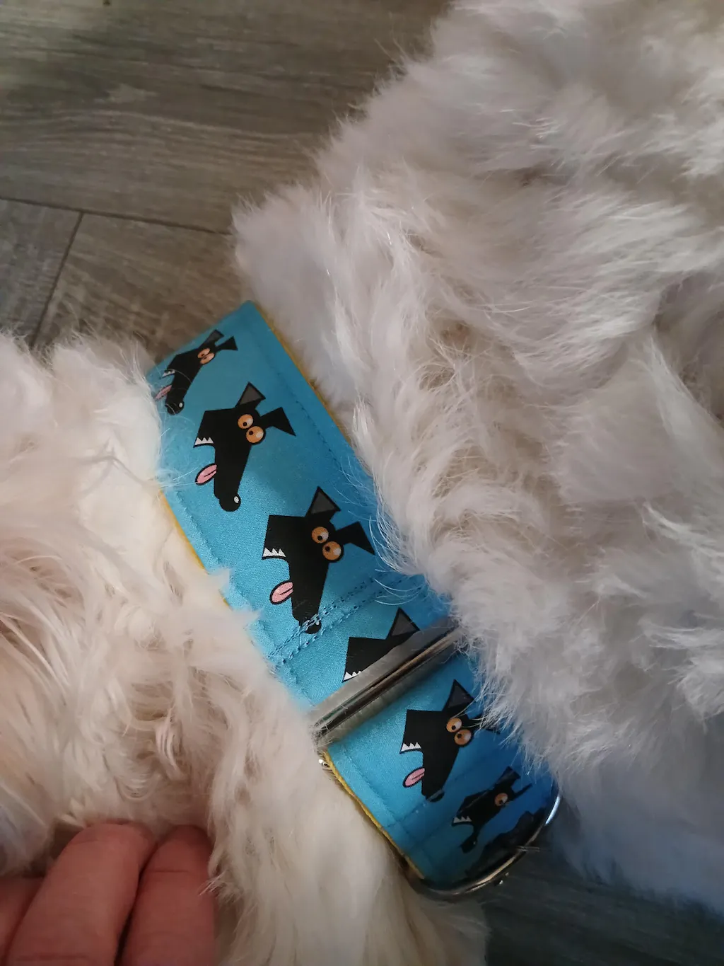 Richard Skipworth has kindly given permission for me to use his fantastic designs to make martingale collars. This one is his blue Derp illustration. You can find Rich's other cool Greyhound stuff on Facebook