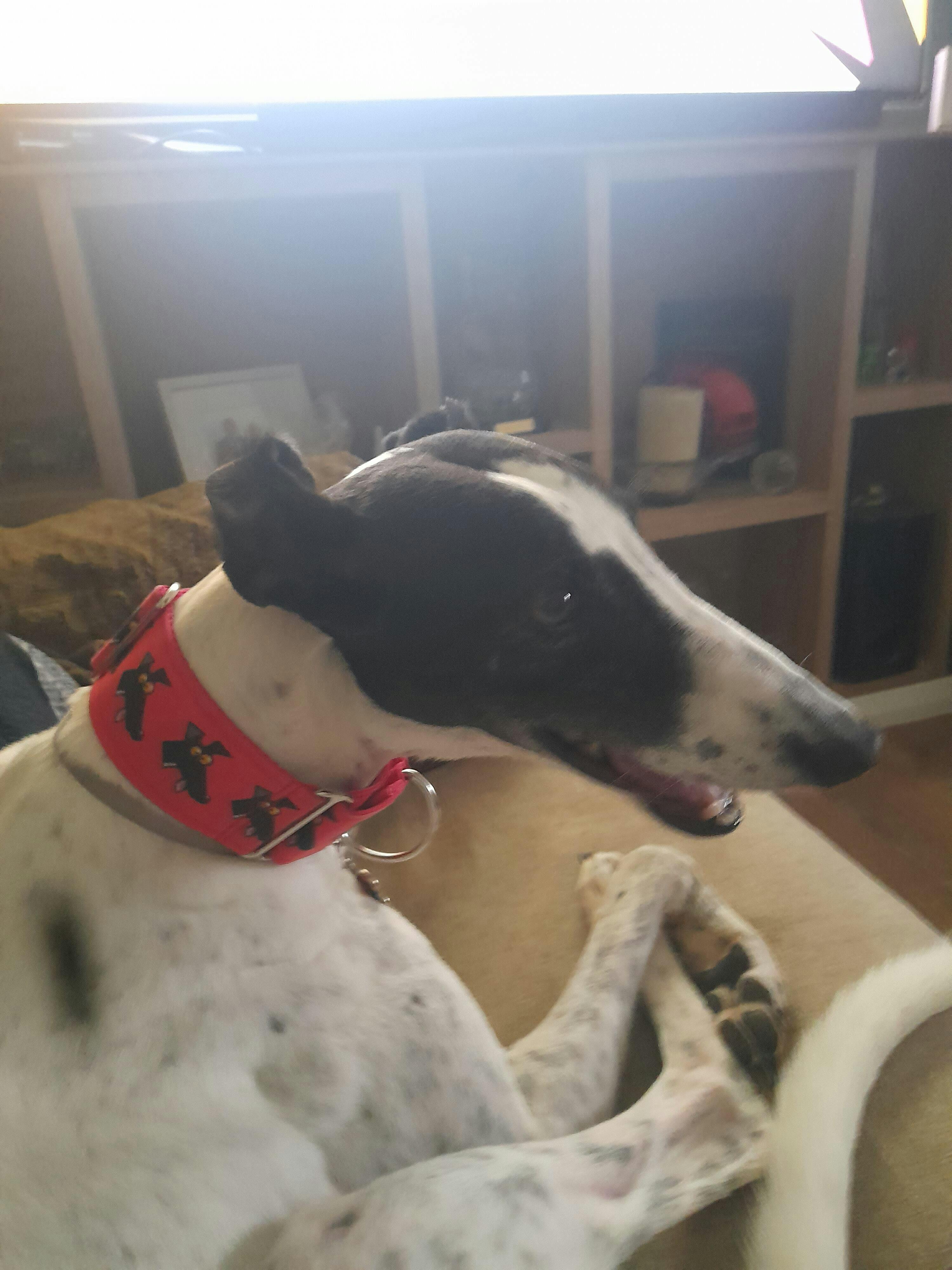 Richard Skipworth has kindly given permission for me to use his fantastic designs to make martingale collars. This one is his red Derp illustration. You can find Rich's other cool Greyhound stuff on Facebook or check out his website. Collars are handmade to order within 5 business days, worldwide shipping. Strong, soft and flexible, polypropylene webbing with welded hardware. Choice of collar width 1.5 or 2 inches.