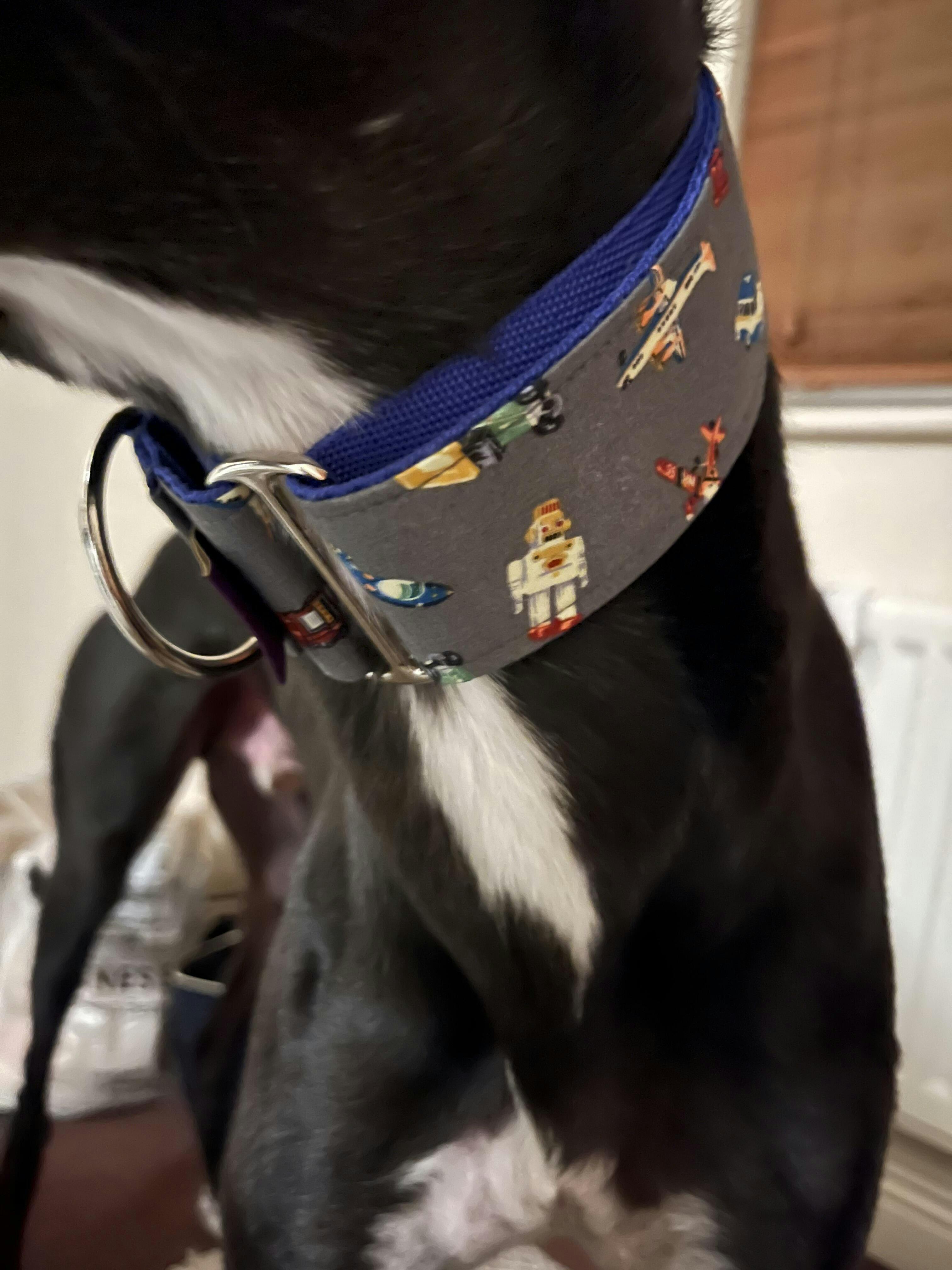 Martingale dog collar. Strong, soft and flexible polypropylene webbing, with a retro toys grey fabric trim. Welded hardware. Handmade to order within 5 business days. Choice of collar width 1.5 or 2 inches.